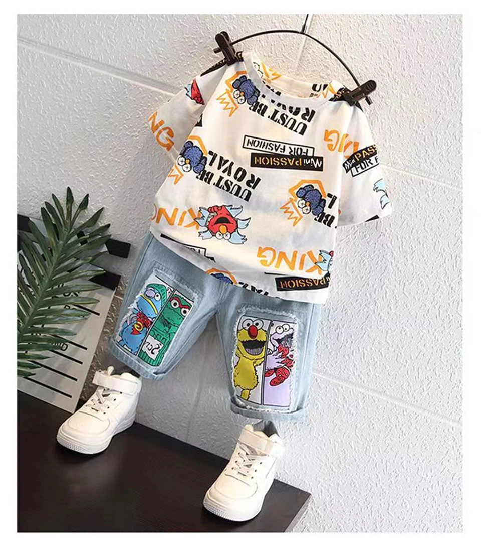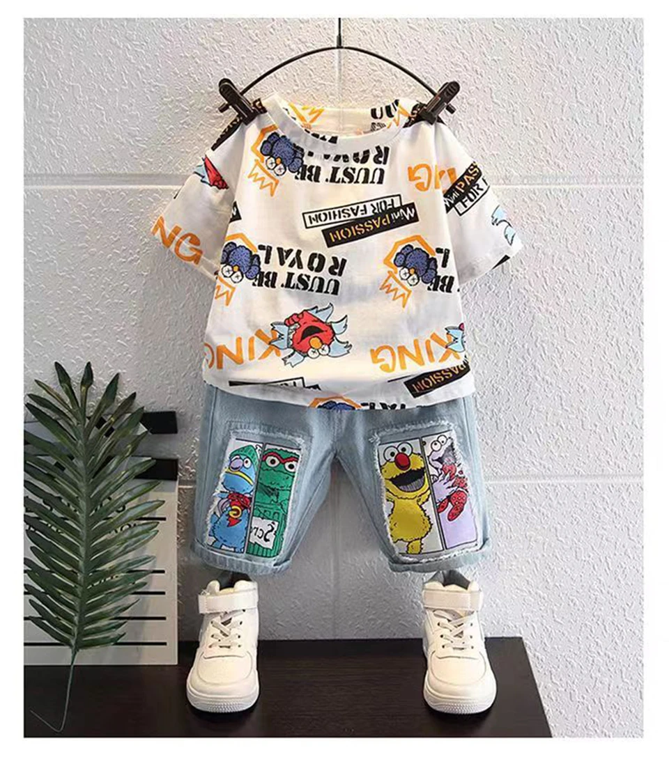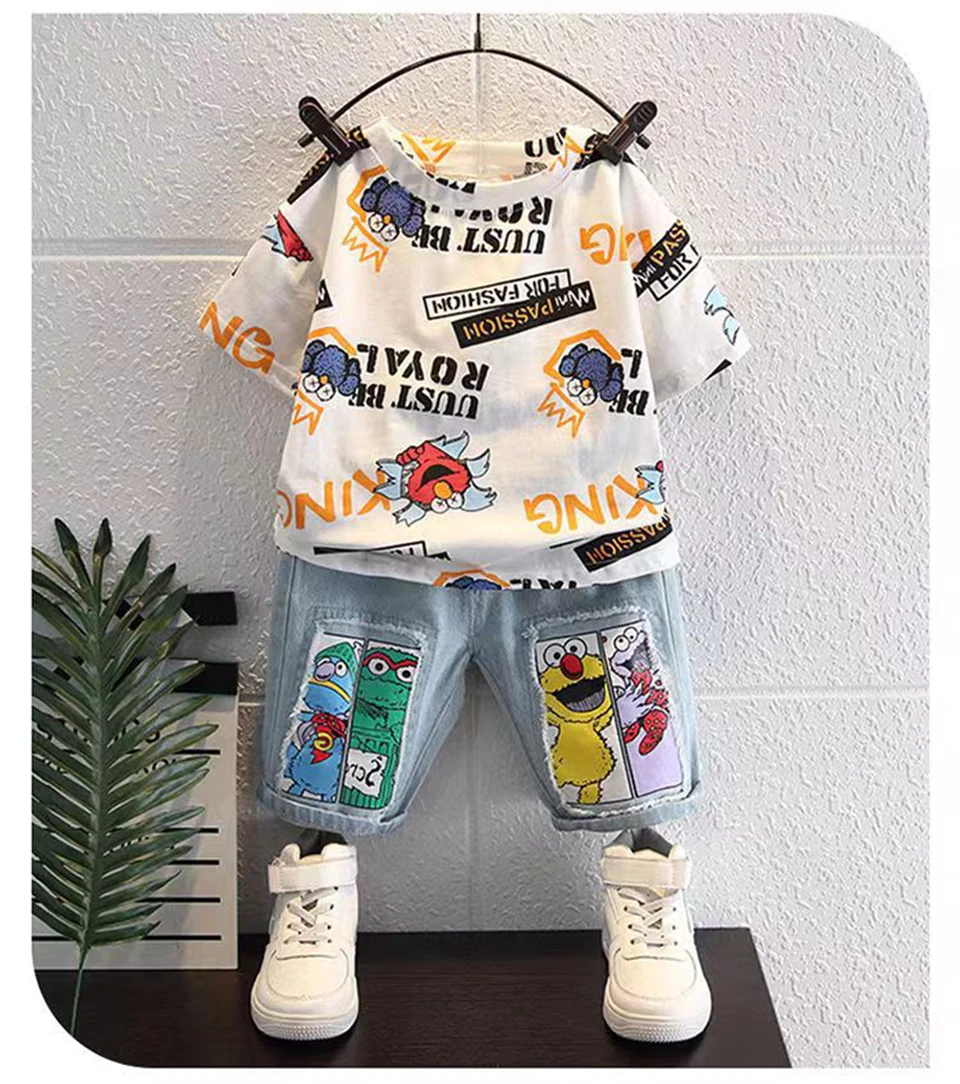 Boys' New Summer Cartoon Print T-Shirt & Denim Shorts Set Get ready for sunny adventures! This cheerful two-piece set features a vibrant cartoon print tee paired with classic denim shorts—the perfect combo for active kids who love bold style. Soft, breathable fabrics keep little ones comfy all day long, whether they're playing in the park or hanging out with friends. Easy to mix and match with other pieces in their wardrobe. Summer fun just got a whole lot cooler!