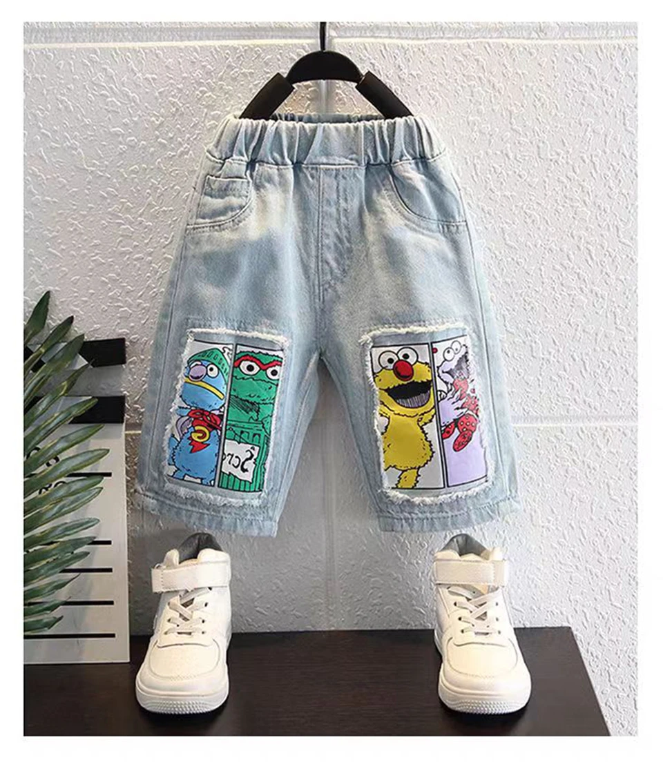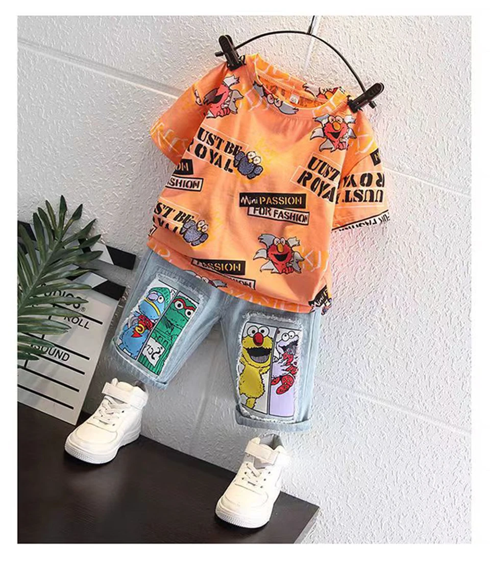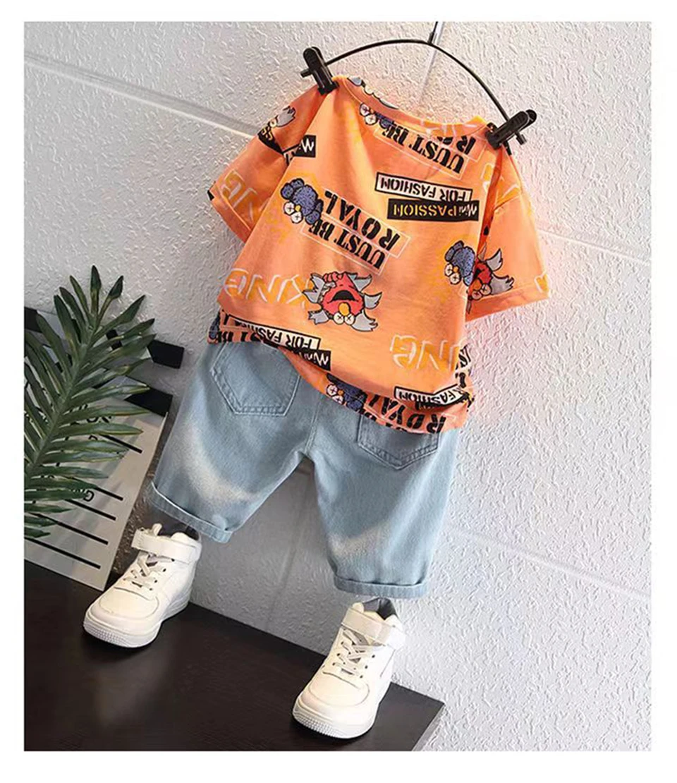 Boys' New Summer Cartoon Print T-Shirt & Denim Shorts Set Get ready for sunny adventures! This cheerful two-piece set features a vibrant cartoon print tee paired with classic denim shorts—the perfect combo for active kids who love bold style. Soft, breathable fabrics keep little ones comfy all day long, whether they're playing in the park or hanging out with friends. Easy to mix and match with other pieces in their wardrobe. Summer fun just got a whole lot cooler!