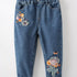 Playful style meets practical comfort in these charming children's jeans! Featuring delightful floral appliqués that add a pop of personality, these jeans are designed with an elastic waist for all-day ease and freedom of movement. Perfect for active kids who want to look fabulous while playing, exploring, and having fun. The soft denim construction keeps them cosy, while the fun details make getting dressed an adventure. A wardrobe essential that's as practical as it is pretty!